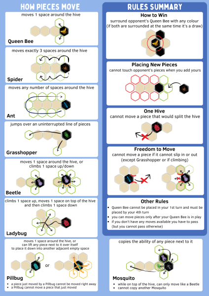 Taken from https://hivegame.com/rules_summary. Graphic summarising important rules of Hive the game.